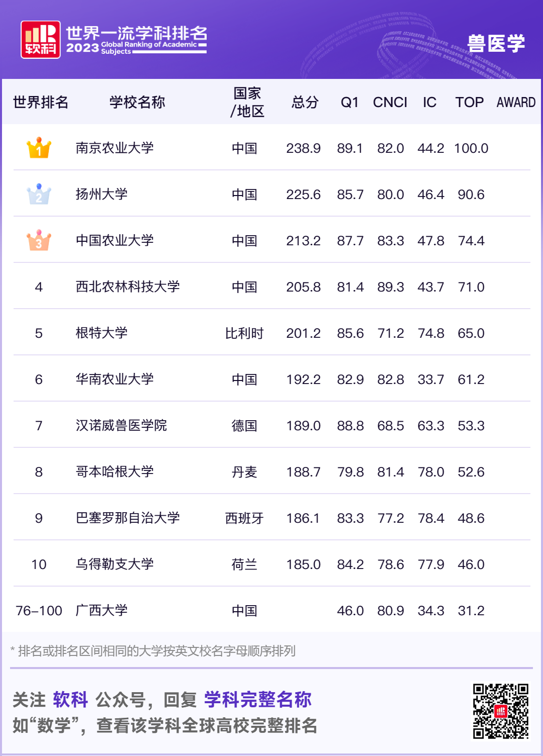 10月27日,高等教育评价专业机构软科正式发布2023“软科世界一流学科排名”,其中太阳集团2138网址的兽医学学科跻身世界前100,位居第76-100名。