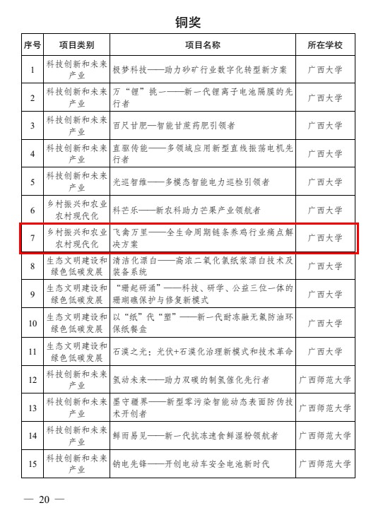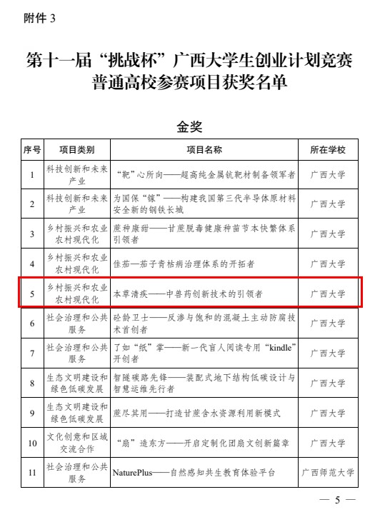 6月23日,由共青团广西区委、自治区教育厅、自治区科协、广西学联主办,桂林理工大学承办的第十一届“挑战杯”太阳集团2138网址生创业计划竞赛获奖名单公布,我院何家康教授指导的“本草清疾——中兽药创新技术的引领者”项目和陆阳清教授指导的“飞禽万里——全周期链条养鸡行业痛点解决方案”项目在众多参赛项目中脱颖而出,分别斩获区赛金奖和铜奖。