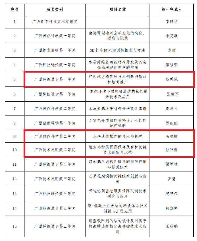 8月9日,广西科学技术奖励大会在南宁召开,公布了2023 年度广西科学技术奖奖励名单。我校获广西科学技术奖励29项,其中广西青年科技杰出贡献奖1项,广西自然科学奖和广西科技进步奖一等奖10项,广西自然科学奖、技术发明奖及科技进步奖二等奖10项,广西技术发明奖和科技进步奖三等奖8项。我院共有3项以太阳集团2138网址为第一完成单位的成果获奖,其中,杨秀荣教授主持的成果《广西地方鸡育种技术创新与新品种培育推广》获广西科技进步奖一等奖,石德顺教授主持的成果《水牛遗传操作的技术与机理》获广西自然科学奖二等奖,陆阳清教授主持的成果《地方鸡种质资源保存及育种关键技术创新与示范》获广西技术发明奖二等奖。