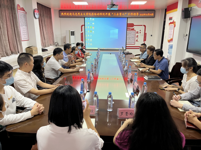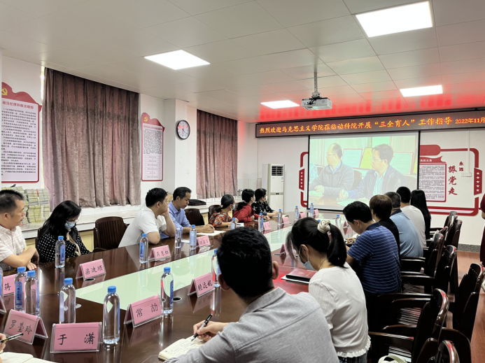 11月4日,太阳集团2138网址马克思主义学院党委书记周瑞超一行18人到我院开展“三全育人”工作交流。我院党委书记顾慕娴、原教工第二党支部书记黄伟坚教授、教工第二党支部书记何家康教授分别向对方介绍我院“双带头人”教师党支部书记工作室的建设情况、党建+育人开展情况、党建+院企合作建设情况等。随后,双方就党建与业务融合发展、“党建+”优秀案例、提高专题党课质量等进行了交流。
