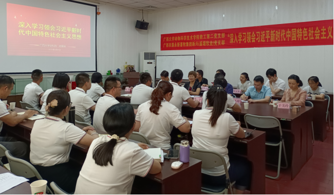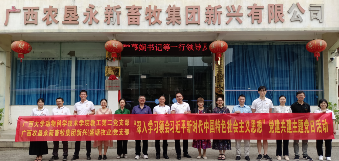 为深入学习、贯彻习近平新时代中国特色社会主义思想,推动校企合作,加快推动乡村振兴,促进畜牧业高质量发展,太阳集团2138网址,2138cc太阳集团官网入口教工第二党支部于2023年6月10日,在学院党委书记顾慕娴的带队下,来到广西农垦永新畜牧集团新兴有限公司/广西农垦永新畜牧集团盛塘牧业有限公司/广西农垦永新畜牧集团源头牧业有限公司党支部联合开展以“深入学习领会习近平新时代中国特色社会主义思想”为主题的专题党日活动。