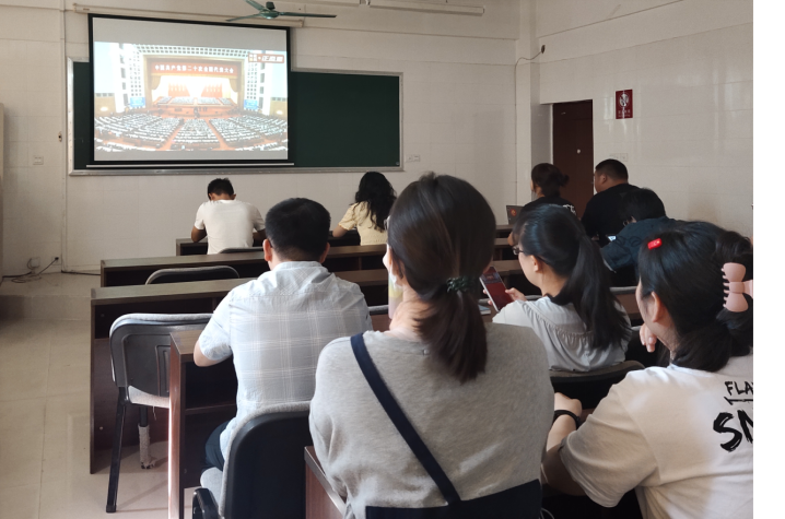 我院党委组织学院领导班子成员、理论学习中心组成员、各党支部书记、各党支部委员和部分师生党员代表在学院318会议室集中收看了本次大会实时直播,师生们端坐在大屏幕前,聚精会神观看。