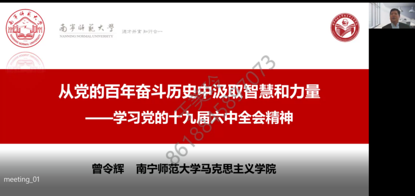 南宁师范大学马克思主义学院院长、自治区党史学习教育宣讲团成员曾令辉教授通过线上讲授了题为“从党的百年奋斗历史中汲取继续前行的智慧和力量——学习党的十九届六中全会和《决议》精神”的党课,曾教授形象生动地从党的百年奋斗历程谈起,详细分析了目前国内外的形势,将我党百年奋斗重大成就和历史经验高度浓缩为“一个主题”、“四个关键词”“四个确立”,总结了党的十九届六中全会和《决议》精神,不时地激励与会党员教师及同学们积极进取,铸牢专业知识和技能,发挥畜牧兽医专业优势,服务三农和乡村振兴。学院各党支部共计400多位党员参加本次线上专题培训。