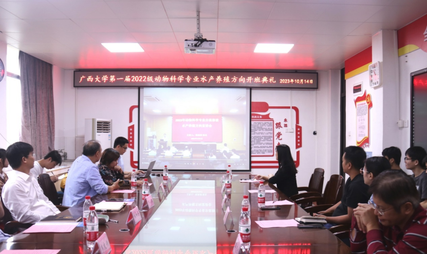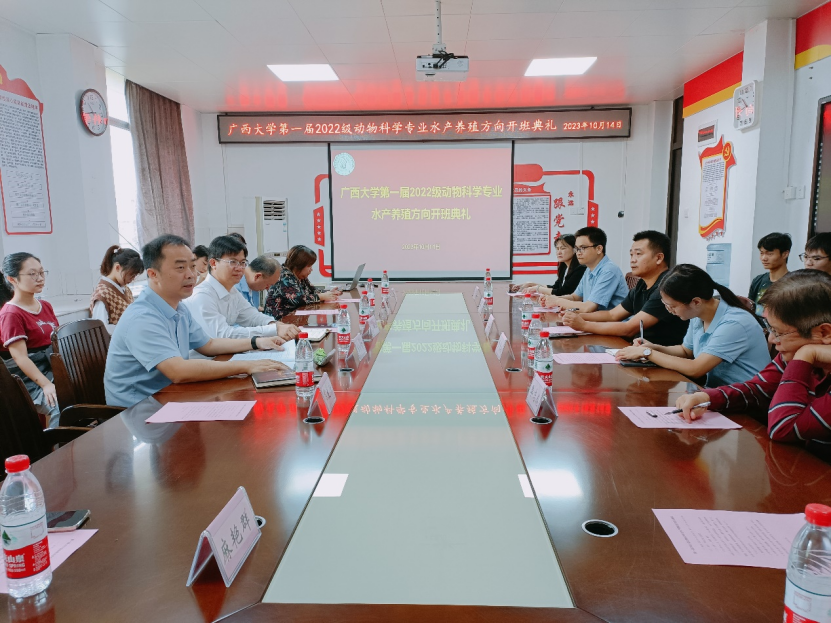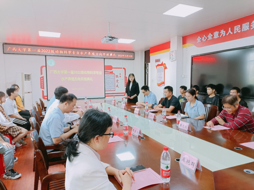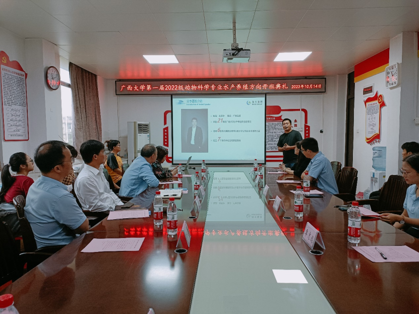 2023年10月14日上午10:30,太阳集团2138网址2022级动物科学专业水产养殖方向开班典礼在太阳集团2138网址302会议室顺利开展。陆阳清院长、韦小强书记、湛江海大饲料有限公司企业代表王其华(技术服务部总监)、企业代表曹春玲(人力资源部经理)、学科带头人潘英教授、黄凯教授、李文红教授、麻艳群副教授、覃志彪讲师、欧伟豪讲师,以及全体2022级动物科学专业水产养殖方向班的同学参加了本次开班典礼。开班典礼由潘英教授主持。