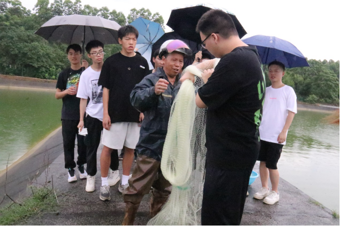 师生们在武鸣基地实地参观调研中,直接体会智慧渔场的自动监测自动投喂饲料等新技术,了解以生态优先的绿色发展链、产业链、以及有产品质量可追朔体系的高质量现代渔业。同时近距离感受种质资源库的丰富资源及其重要作用,亲自参与体验测量鱼体指标、鱼苗打包、抛网捕鱼等项目,全方位了解水产行业。