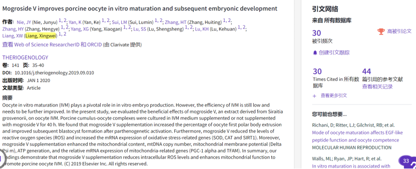 2. Nie J., Yan K., Sui L., Zhang H., Zhang H., Yang X., Lu S., Lu K., Liang X.: Mogroside V improves porcine oocyte in vitro maturation and subsequent embryonic development. Theriogenology 2020;141:35-40 (入选ESI高被引论文)