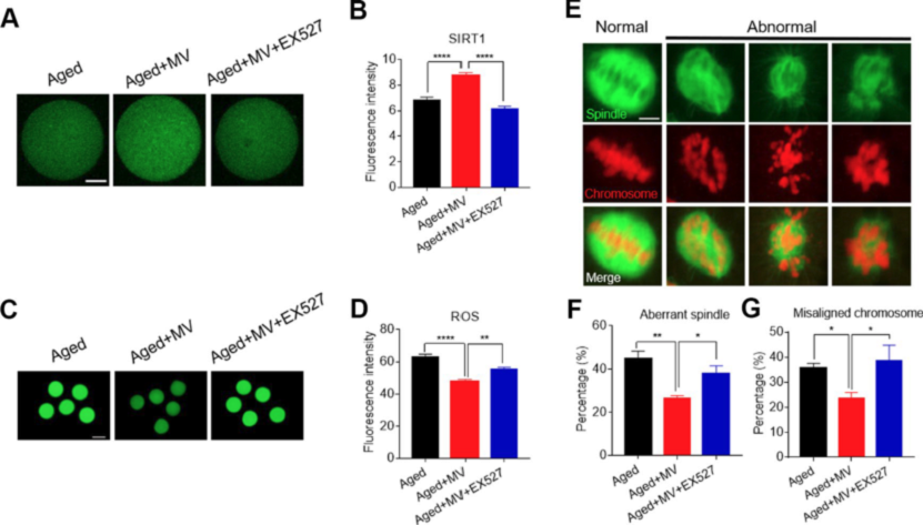 2.发现罗汉果甜苷V能有效延缓猪卵子老化进程(Aging 2019),缓解环境污染物苯并芘(Frontiers in pharmacology 2021)、内毒素脂多糖(Front Cell Dev Biol 2021)、热应激(未发表数据)对卵子成熟的损害,可能与罗汉果甜苷V对线粒体功能保护及降低胞内ROS水平有关(图2)。本研究结果为利用植物提取物缓解有害应激对卵子发育损伤提供重要的可选方案。