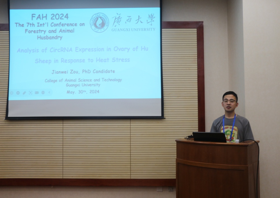 我院2022级畜牧学博士研究生邹剑伟和2023级畜牧学硕士研究生吴少强参加了此次会议,邹剑伟在会议上做了题为“Analysis of CircRNA Expression in Ovary of Hu Sheep in Response to Heat Stress”的口头汇报。