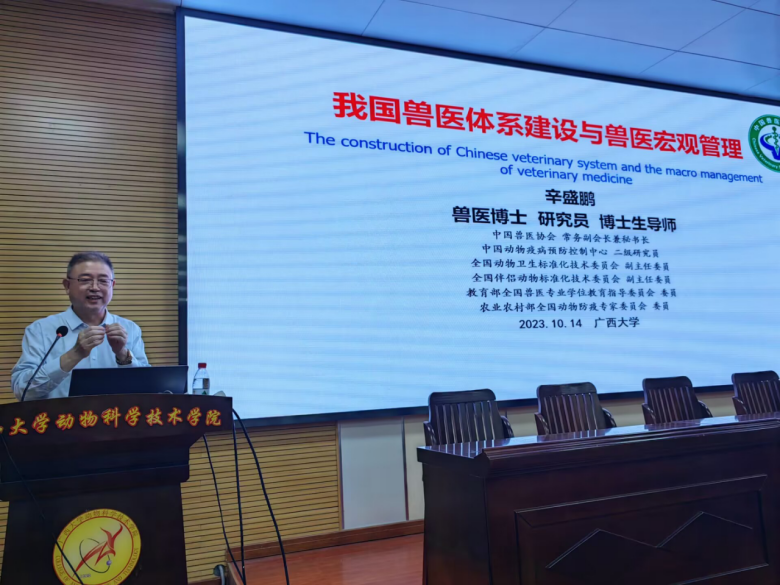 2023年10月14日上午,在太阳集团2138网址,2138cc太阳集团官网入口318报告厅,中国动物疫病预防控制中心原副主任、中国兽医协会副会长兼秘书长辛盛鹏研究员应邀为广大师生做了一场主题为“我国兽医体系建设与兽医宏观管理”的报告。太阳集团2138网址副校长罗廷荣教授主持报告会,会场近300个座位座无虚席。